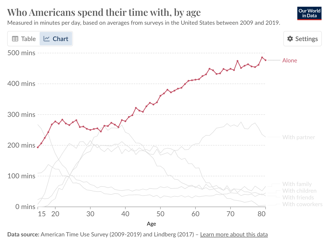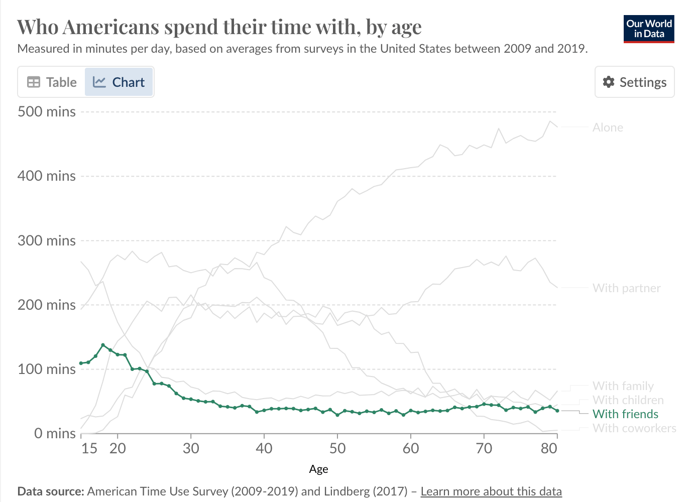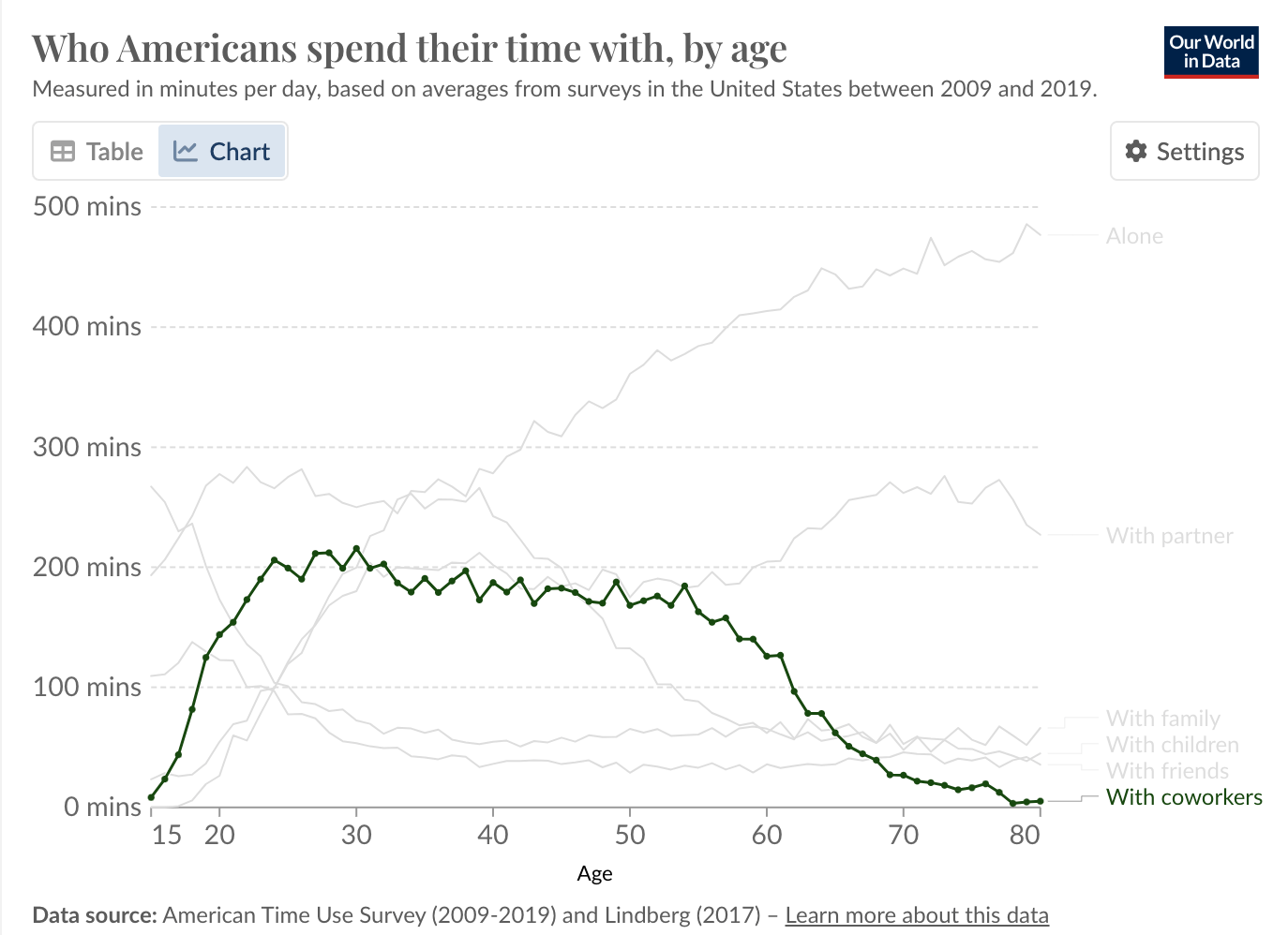 A while back, I came across some fascinating data from the U.S. Bureau of Labor Statistics. They measured how much time Americans spend with other people over the course of 90 years.